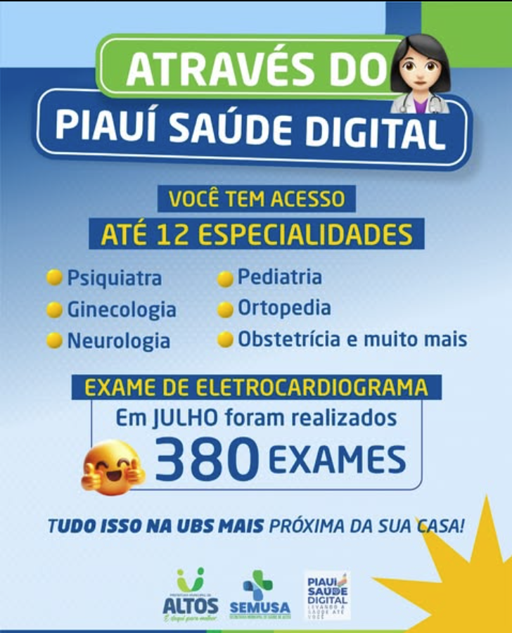 A Prefeitura de Altos, em parceria com a SEMUSA e o Piauí Saúde Digital, oferece atendimento em até 12 especialidades médicas, como psiquiatria, ginecologia, pediatria e ortopedia. Só em julho, foram realizados 380 exames de eletrocardiograma nas UBS do município, garantindo atendimento rápido, moderno e humanizado à população.