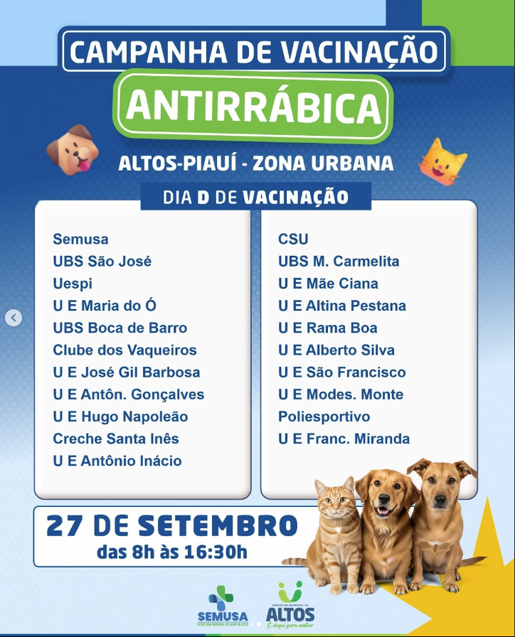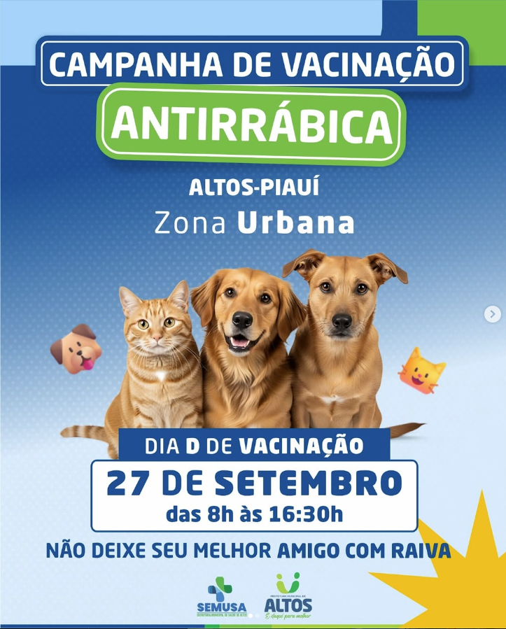 A contagem regressiva começou! No próximo sábado, dia 27, a zona urbana de Altos recebe o Dia D de Vacinação Antirrábica, uma ação fundamental para a saúde dos animais e da comunidade. Os tutores devem ficar atentos aos pontos de vacinação espalhados pelo município. A iniciativa garante proteção contra a raiva e reforça o cuidado com nossos pets. Confira os locais disponíveis e leve seu cão ou gato para se vacinar!