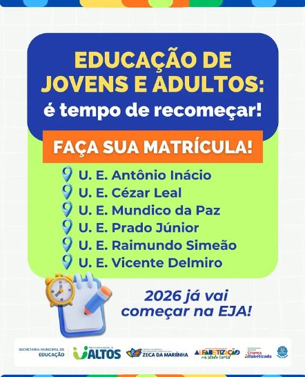 A Secretaria Municipal de Educação de Altos informa que estão abertas as matrículas para a Educação de Jovens e Adultos (EJA), modalidade de ensino destinada às pessoas que desejam retomar os estudos e concluir sua formação escolar. A iniciativa reafirma o compromisso do município com a inclusão educacional, garantindo oportunidades de aprendizagem para jovens, adultos e idosos que, por diferentes motivos, não puderam concluir seus estudos na idade regular.