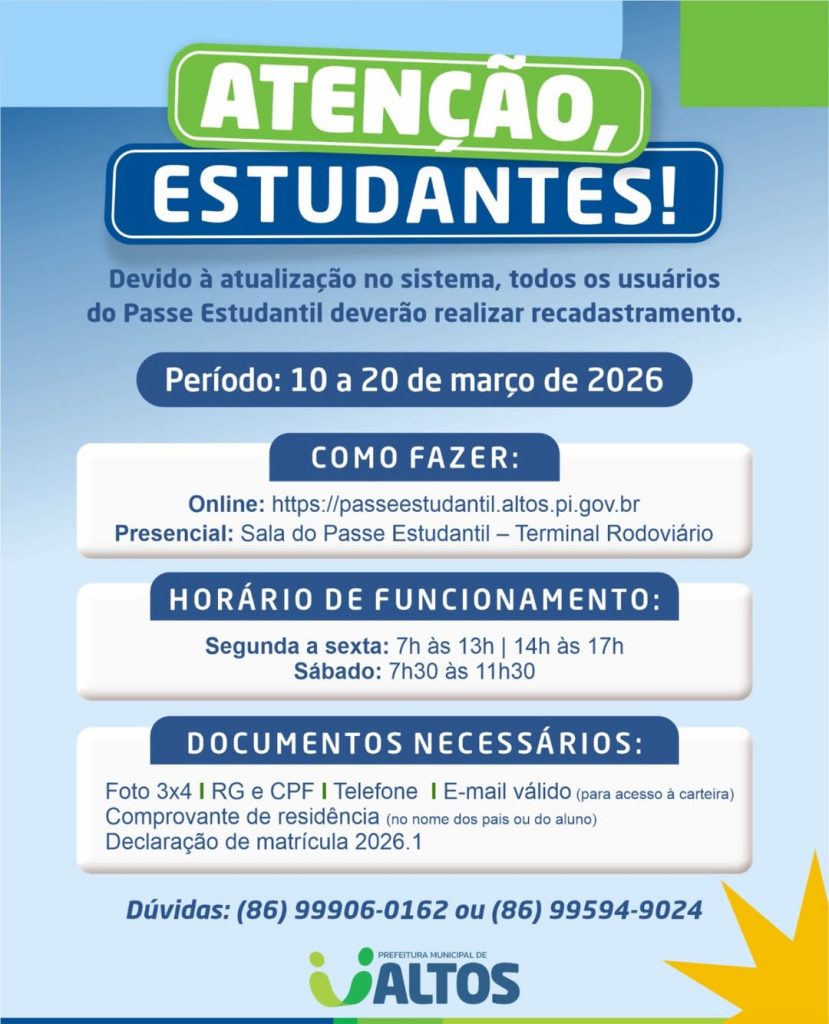 A Prefeitura Municipal de Altos informa que estará aberto, de 10 a 20 de março de 2026, o período de recadastramento do Passe Estudantil. A atualização é obrigatória para todos os usuários do benefício, em razão da atualização do sistema.