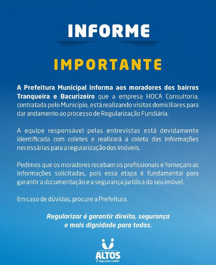 A Prefeitura Municipal de Altos informa aos moradores dos bairros Tranqueira e Bacurizeiro que está em andamento o processo de Regularização Fundiária no município, com o objetivo de assegurar a documentação oficial e a segurança jurídica dos imóveis.