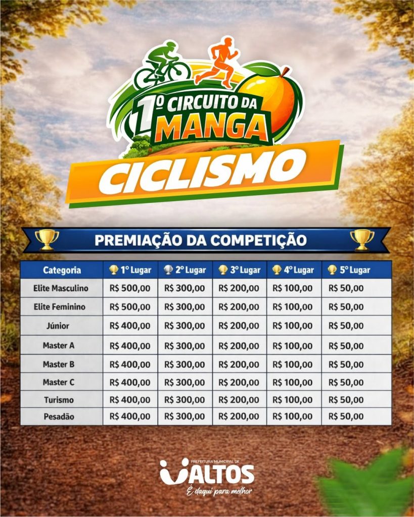 A Prefeitura Municipal de Altos convida toda a população para participar do 1º Circuito da Manga, que será realizado no dia 08 de março, no município. O evento esportivo integra as ações de incentivo ao esporte, ao lazer e à valorização da cultura local, reforçando o compromisso da gestão com a promoção da saúde e do bem-estar da população.