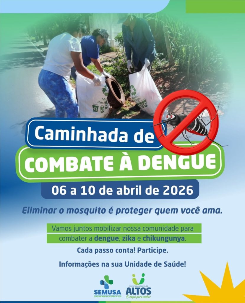 A Prefeitura Municipal de Altos, por meio da Secretaria Municipal de Saúde (SEMUSA), realizará, entre os dias 06 e 10 de abril de 2026, a Caminhada de Combate à Dengue, com o objetivo de mobilizar a comunidade no enfrentamento às arboviroses, como dengue, zika e chikungunya.