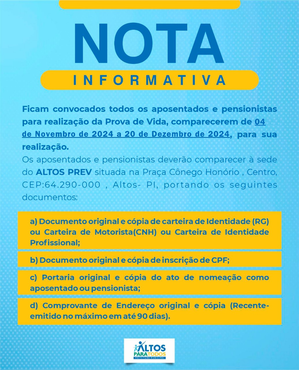 Os aposentados e pensionistas vinculados ao Fundo de Previdência do Município de Altos (ALTOS PREV) devem se preparar para realizar a Prova de Vida Anual de 2024, conforme estabelecido pelo Decreto nº 056/2024, publicado no Diário Oficial das Prefeituras em 30 de outubro de 2024. Este procedimento obrigatório ocorrerá entre os dias 4 de novembro e 20 de dezembro de 2024, com o objetivo de manter a regularidade do pagamento dos benefícios.